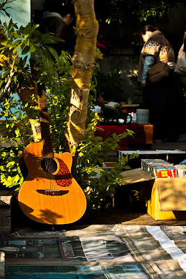我順著側邊的小徑走進庭院,鋪滿地面的商品有新有舊整齊地排列著,等待著再次服務的機會。我彎下腰輕撥著吉他的琴弦,聲音清亮,還不錯!值得帶,只是家中已有一把夠用的老琴,與其帶回去閒置在屋角,不如還是留它在這邊,留給更適合更需要它的人吧!